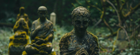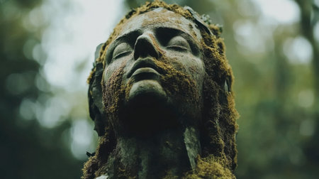 A tranquil close-up of a moss-covered statue nestled in a serene forest, reflecting the beauty of nature and the passage of time in a peaceful setting.