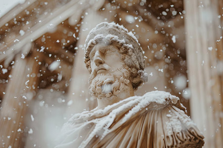 Snowflakes Falling on an Ancient Statue in Winter
