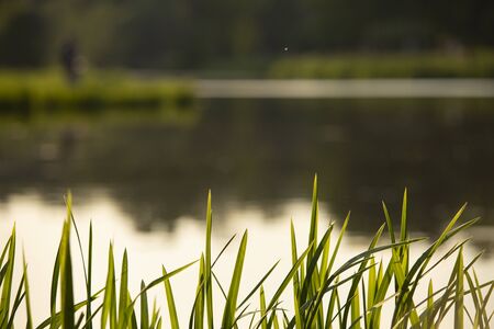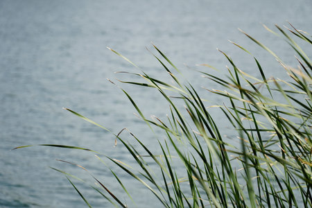 grass on the background of a blurred lake.