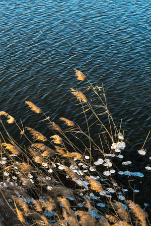 Detail of dry grass on the lake shore. Focus on ear of grass.