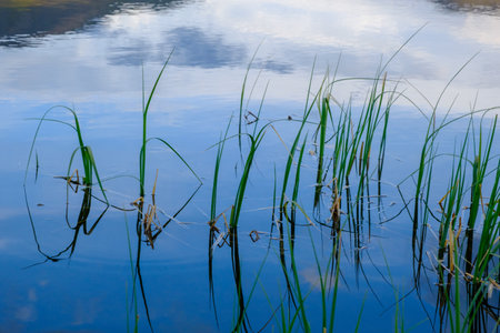 Close-up blades of grass growing from lake water with reflection