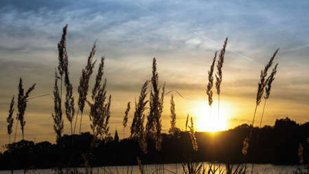 Banner natural autumn landscape river Bank dry grass reeds water nature. Selective focus blurred background