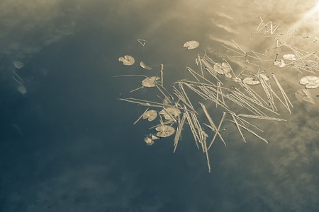 Leaves of lilies and reed lines float on the surface of the lake with reflection of the oboaks during sunset