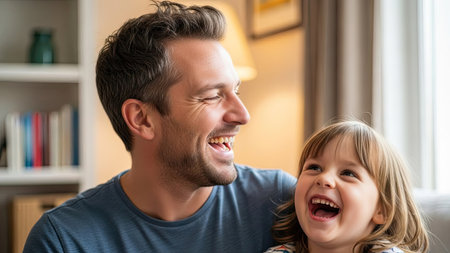A close-up captures a father and child sharing a moment of joy. The image displays warm tones and soft lighting. They appear relaxed and happy in a domestic setting, suggesting a close relationship. This image could be used for various commercial or editorial purposes.