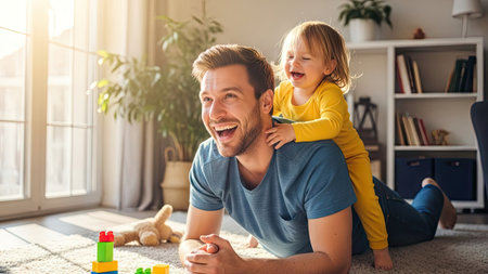 A father and child are depicted in a scene of shared joy, interacting within a well-lit indoor environment. The image showcases a happy father and child. The composition emphasizes the relationship, with soft lighting and neutral tones. Suitable for illustrating family life or use in commercial contexts.