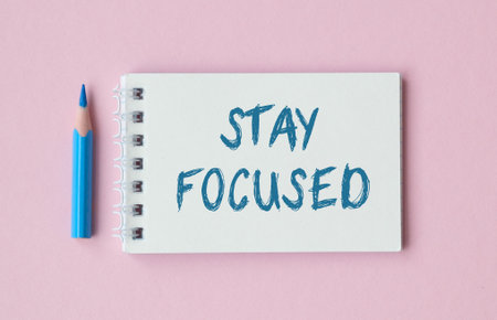 A pencil is on a piece of paper with the words Stay Focused written on it. The pencil is blue and the paper is white