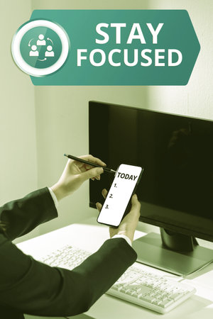 Text showing inspiration Stay Focused. Concept meaning Be attentive Concentrate Prioritize the task Avoid distractions