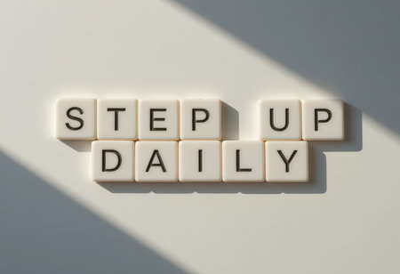 A clean and simple arrangement of white letters spelling Step Up Daily on a light background, emphasizing motivation and daily commitment to personal growth and positivity.