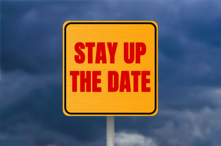 Stay up the date message written on metal sign on cloudy sky background. Conceptual stay up the date symbol. Copy space.