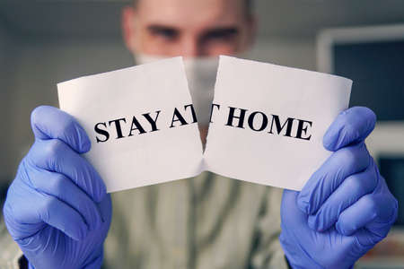 End of pandemic. Man tearing card with hashtag stay at home. Victory in fight against Pandemic. Exit from self-isolation to freedom.