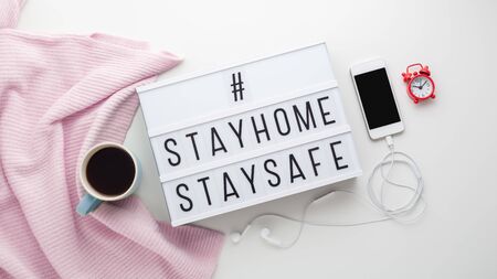 Stay home stay safe concept. Top view coffee cup, blanket and message Stay home on white desk. Coronavirus COVID-19 quarantine, self isolation, lockdown poster