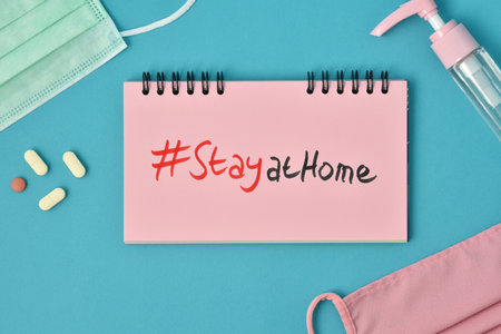 The inscription “Stay at home†with pills, medical mask, and a sanitizer - new normal concept