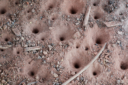 cone-shaped pits created by antlion larva in sandy soil, used to trap ants and small insect.