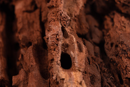 Close up of a tree stump that has been populated by ants. The corridors can be clearly seen