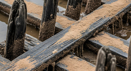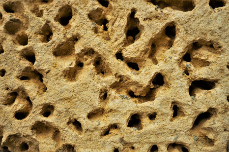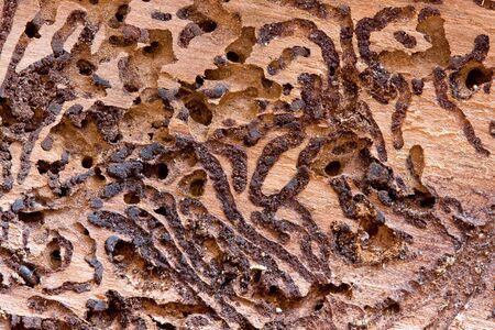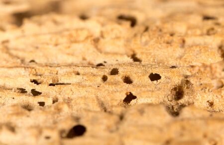 Old damaged wood as a symbol of aging decay or termite insect damage as a tree rotting with holes and tunnels weathered by natural elements in a close up.