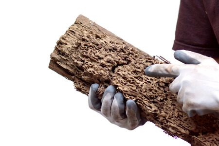 Hand of a carpenter pointing at a wood plank destroyed by termites isolated on white