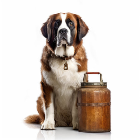 A Saint Bernard (Canis lupus familiaris) as a mountain rescuer, with a tiny barrel of brandy.
