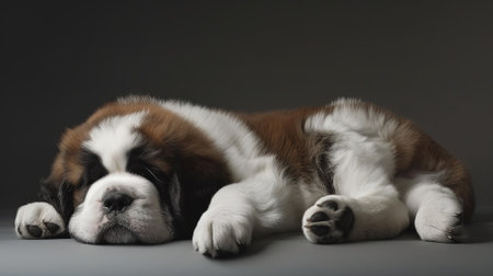 Sleeping Saint Bernard puppy on grey background. Studio shot.