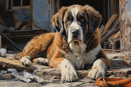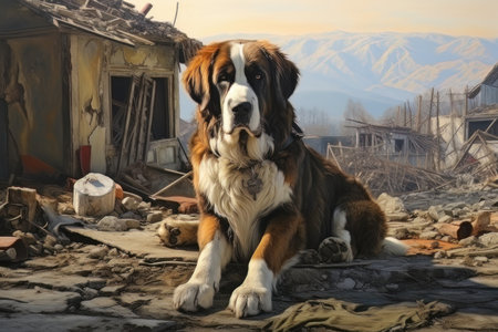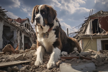 Rescue dog against the background of ruins AI