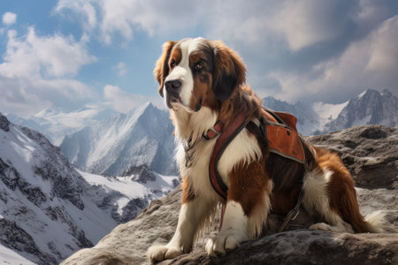 A large brown and white Saint Bernard dog is sitting majestically on top of a beautiful mountain, enjoying the breathtaking view around it