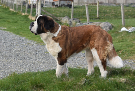 young Bernard dog sunny afternoon on a background of green grass