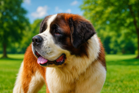 AI-Generated image of a St. Bernard dog standing on green grass in a sunny park. The dog has a thick, fluffy coat of brown, white, and black fur, with a gentle expression and its tongue slightly out as it pants.