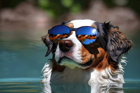 A dog wearing sunglasses swimming in the water