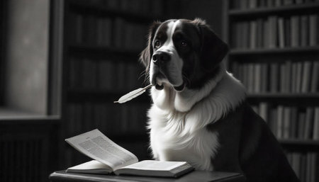 St Bernard Dog With Quill Pen Reading in Library