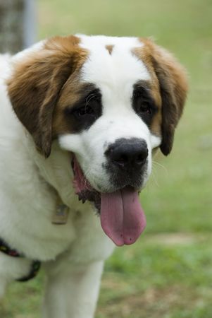 one saint bernard puppy dog with the tongue out posing for the camera on the grass in the park