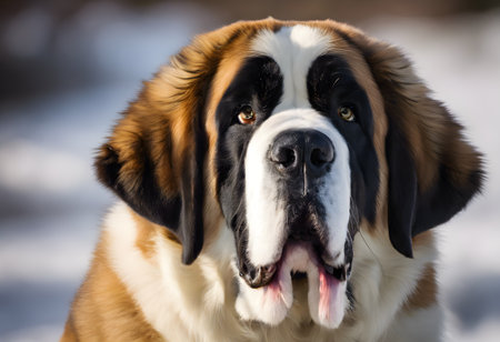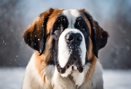 Portrait of a St. Bernard dog on a snowy background.