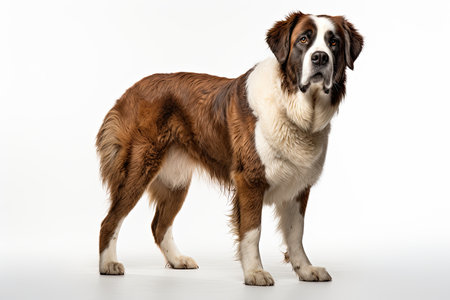 A magnificent Saint Bernard stands in a dignified profile against a clean studio background. Its calm and steady gaze exudes a sense of gentle strength, loyalty, and quiet confidence, embodying the noble spirit of this iconic and beloved breed.