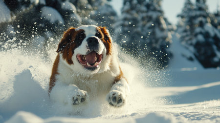 A joyful Saint Bernard dog runs energetically through a fresh blanket of snow, showcasing its playful nature in a stunning winter landscape.