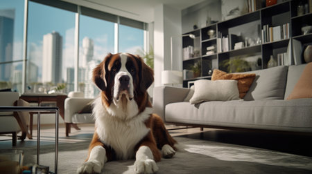 fluffy Saint Bernard remains calm and composed displaying gentle demeanor amidst clean bright setting enhances its natural beauty.