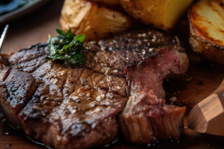 close-up of juicy and tender steak, with crispy potatoes on the side, created with generative ai