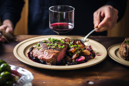 man coats beefy steak with red wine sauce