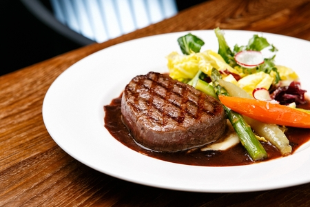 Steak with vegetables on a white plate in a restaurant. Restaurant