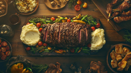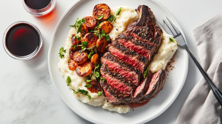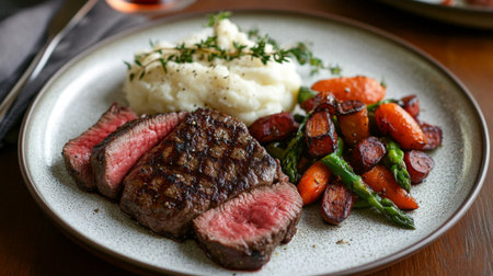 An exquisite grilled steak dish featuring tender cuts served with creamy mashed potatoes and colorful vegetables, ideal for food enthusiasts and culinary showcases.