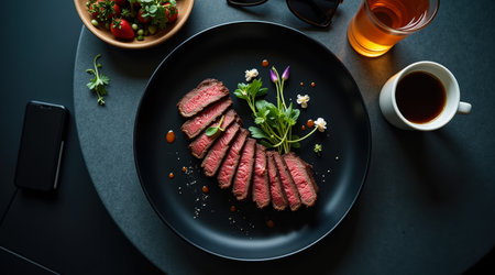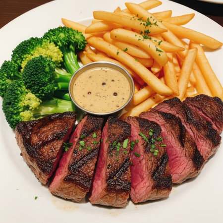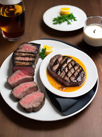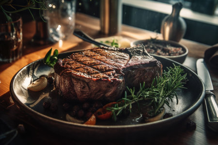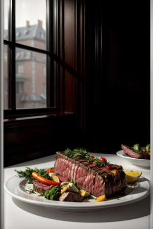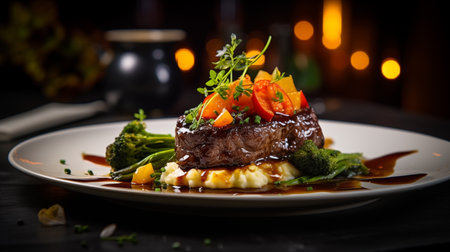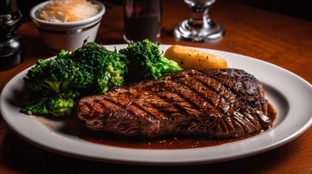 An AI generated illustration of a succulent steak dinner on a plate freshly prepared in a restaurant
