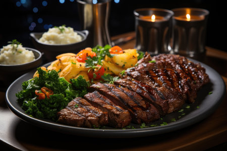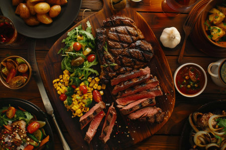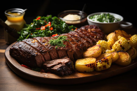 Succulent grilled picanha surrounded by colorful side dishes., generative AI