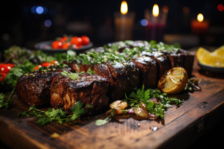 Grilled picanha with fresh herbs, in an outdoor barbecue with live music and party lights on a summer night, under the moonlight and a bright moon, un