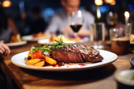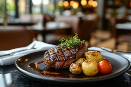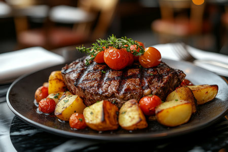Grilled beef steak with potatoes and tomatoes on a plate in a luxurious restaurant with a luxurious bistro interior.