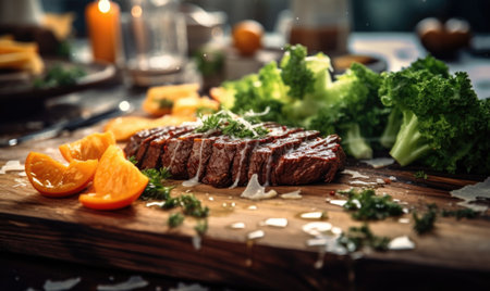 Grilled beef steak on a wooden board with vegetables on the table