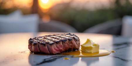 AI Generated. Juicy grilled steak with grill marks served alongside a dollop of butter on a marble table at sunset in a serene outdoor setting