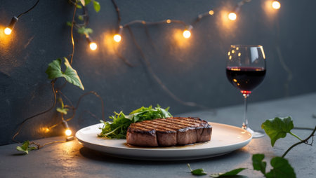 AI Generated. Grilled Steak Dinner Underneath Outdoor String Lights