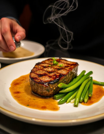 Tender steak cooked to perfection is being carefully garnished with aromatic herbs. The rich sauce enhances its flavor, creating an appetizing presentation ideal for a fine dining experience.