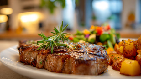 Juicy steak topped with fragrant rosemary, accompanied by golden roasted potatoes and a vibrant veggie medley, presenting a warm and inviting meal in a charming kitc