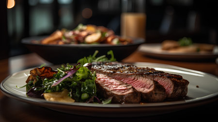 Juicy grilled fillet steak on a plate with fresh salad generated by artificial intelligence