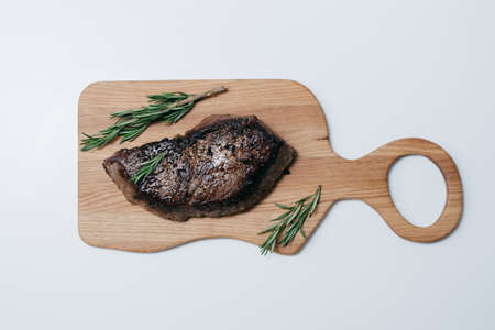 large piece of steak with rosemary on a wooden board