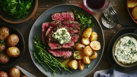 A perfectly cooked beef steak on a plate, topped with a pat of herb butter, accompanied by roasted potatoes and fresh greens, creating an appetizing culinary scene.