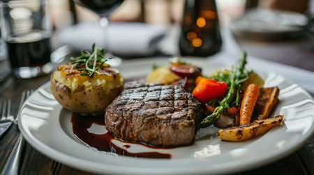 A steak dinner set with grilled vegetables and a baked potato, served on a elegant plate for a luxurious dining experience.